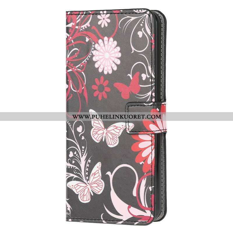 Nahkakotelo Samsung Galaxy M12 / A12 Perhosia Ja Kukkia